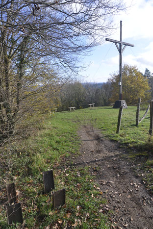 Les segments de poutrelle que l’on voit émerger du sol, non loin de la croix actuelle, sont les vestiges de la structure qui soutenait la croix d’origine. Son déplacement a été rendu nécessaire par la croissance des arbres qui l’auraient rendue invisible d’Aywaille.