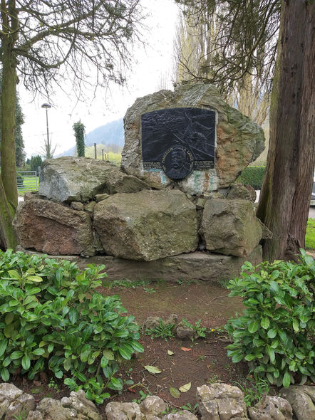 Assemblage de gros blocs de grès local supportant un bas-relief illustrant une légende de Marcellin La Garde et en portant, en médaillon, un portrait de cet auteur local et sur lequel on lit :